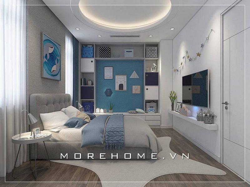 Mẫu kệ trang trí gỗ công nghiệp được thiết kế với âm tường và ô tủ giúp tạo nên sự đa dạng và hiện đại, đồng thời làm nổi bật vẻ đẹp của phòng ngủ của bé trai.