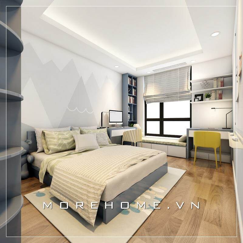 . Giường tầng hiện đại cùng với tủ kệ tiện dụng là sự lựa chọn tuyệt vời cho không gian phòng ngủ trẻ em. Bàn học được bố trí gần giường tạo nên một không gian trọn vẹn.