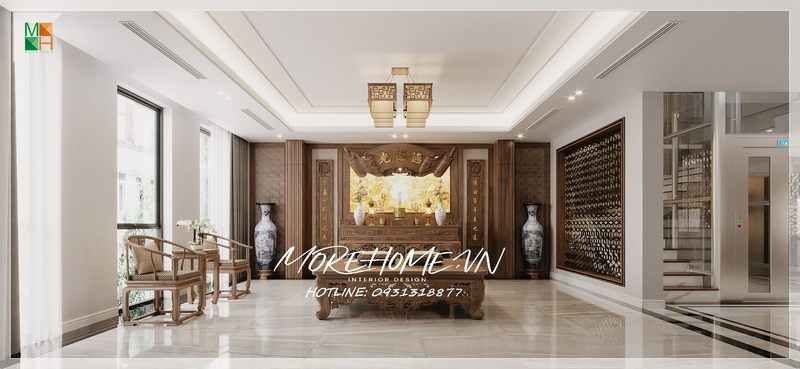 Các đồ nội thất phòng thờ được sắp xếp phân chia bố cục khoa học tạo nên không gian với sự gọn gàng thông thoáng dễ dàng cho việc thờ cúng.