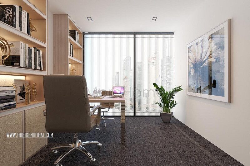 Thiết kế nội thất cho phòng làm việc theo phong cách sang trọng với sự bố trí hợp lý và tiện nghi.